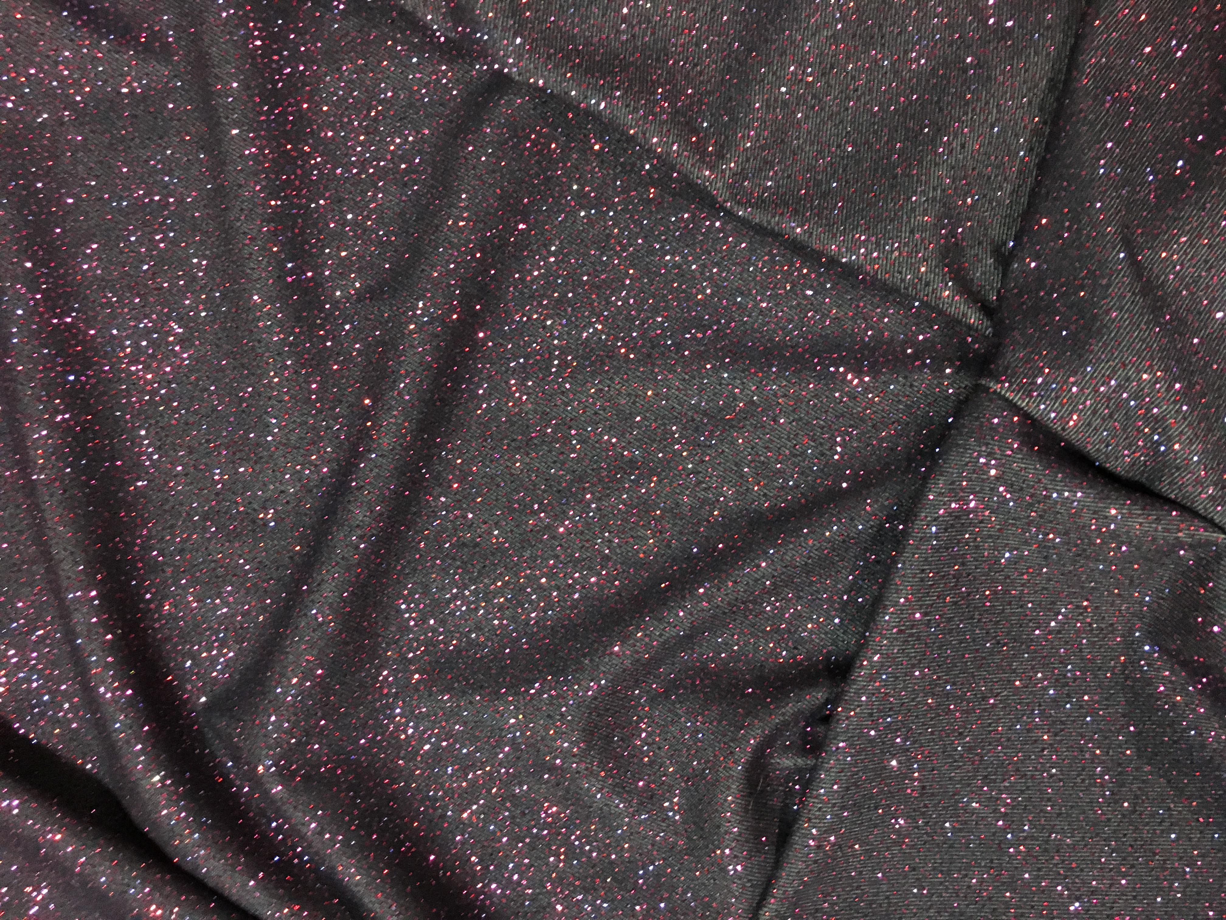 This 4-way stretch fabric looks like denim but is spandex. The pink sparkles really sparkle! It is 60″ wide.